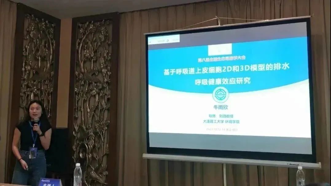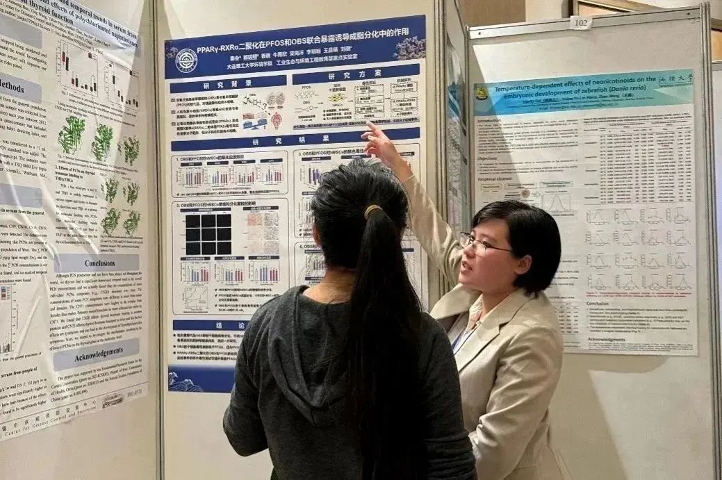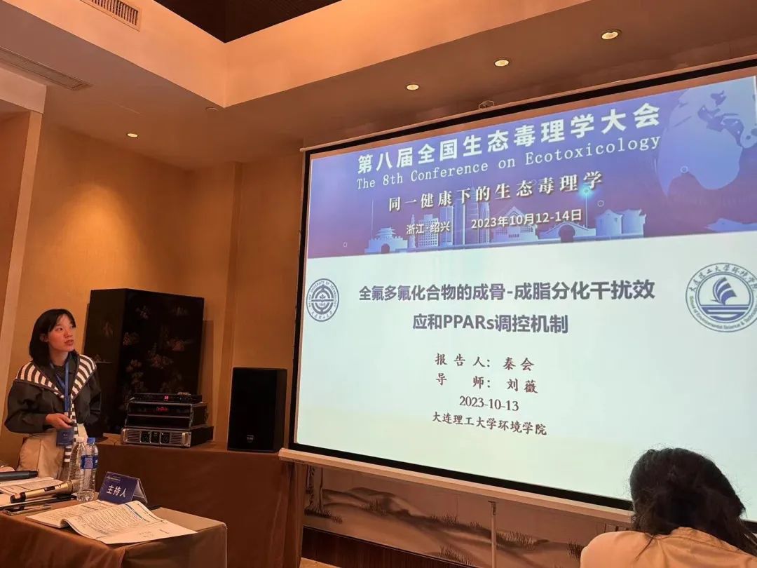 课题组博士研究生秦会在研究生论坛进行了题目为“全氟多氟化合物的成骨-成脂分化干扰效应和PPARs调控机制”的口头报告(图3),着重介绍低剂量PFASs对干细胞多向分化的毒性效应及分子启动毒性机制,对PFASs高通量高灵敏毒性筛查有重要意义。博士研究生牛雨欣在研究生论坛进行了题目为“基于呼吸道上皮细胞2D和3D模型的排水呼吸健康效应研究”的口头报告(图4),旨在揭示排水与呼吸健康有害结局之间的关系,对提高水处理技术的减毒效率提供参考。硕士研究生郎玥明以“PPARγ-RXRα二聚化在PFOS和OBS联合暴露诱导成脂分化中的作用”为题进行了展板报告,与参会学者进行了充分讨论(图5)。